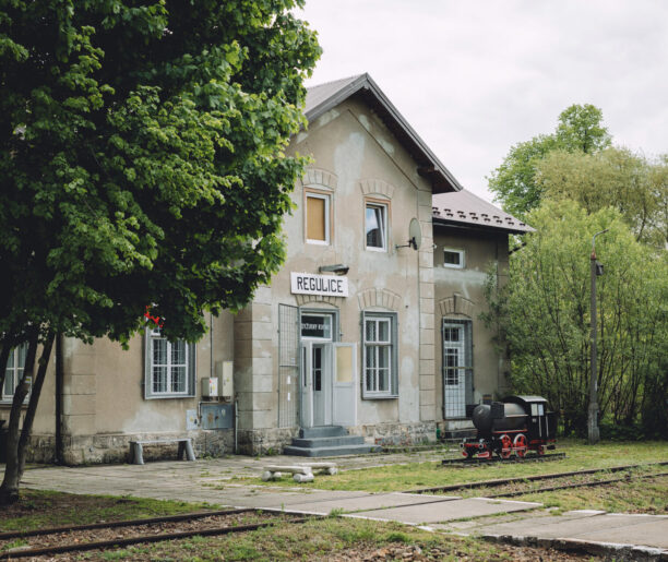 Jak wygląda regulicka drezyna rowerowa? To platforma pomalowana na wesoły kolor kaczeńców (czyli knieci błotnej, którą bystre oko wypatrzy w rojstach wzdłuż trasy), mieszcząca ładunek maksymalnie czworga dorosłych i nie za dużego dziecka. Rada pierwsza: pamiętajmy, że pierwsza i ostatnia z obecnie dostępnych piętnastu drezyn zabiera na pokład dodatkowy balast – osobę kierującą ruchem. Po obu stronach platformy są zamontowane dwa przypominające stacjonarne rowery „napędy” – z kółkiem zamiast kierownicy (wszak nie będziemy skręcać) i uchwytem na napój (nie bez powodu). Pomiędzy nimi znajduje się ławeczka z kocykiem oraz kosz na bagaże. Uczestnicy wycieczki napędzają drezynę siłą własnych mięśni, dlatego warto mieć świadomość, że pedałowanie w tempie, w dodatku bez wspomagania elektrycznego czy przerzutek, wymaga dość sporo wysiłku. Prawo do hamowania mają wyłącznie dorośli!