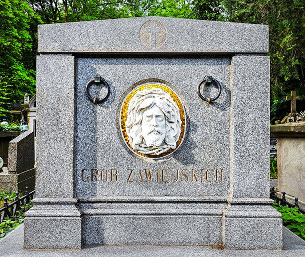 nad reprezentacyjnymi schodami, pomiędzy kariatydami podtrzymującymi strop, umieszczono rzeźbę głowy dżentelmena w średnim wieku, z lekko zakręconymi do góry wąsami, z przedziałkiem po środku, poważnie patrzącego na widzów. To Jan Zawiejski.