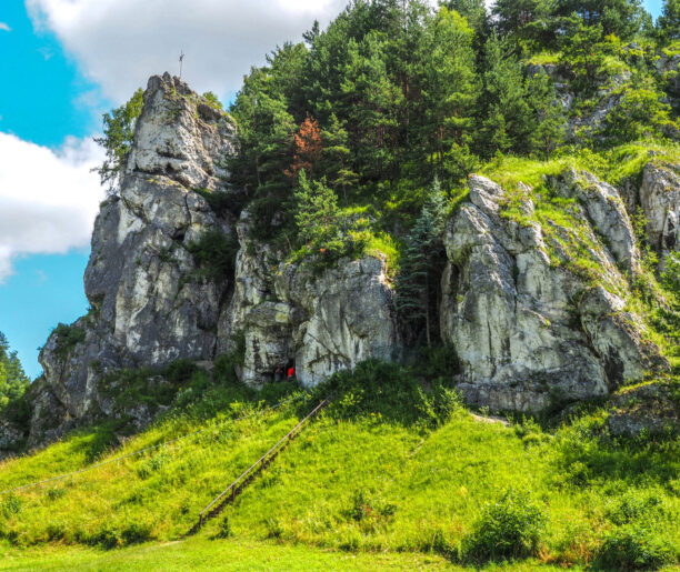 Gdy miniesz Brandysówkę, po ok. 200 m zobaczysz odbijającą w lewo drogę. Przez kładkę na potoku Będkówka zaprowadzi Cię do niezwykłego miejsca na naszej trasie. Po prawej stronie ujrzysz Wodospad Szum. Choć nie wpasowuje się on w motyw tego spaceru, jest zbyt piękny, by go pominąć. To największy wodospad na Wyżynie Krakowsko-Częstochowskiej. W warunkach stosunkowo ciepłej Jury nie zamarza zimą i jego radosny szum słychać o każdej porze roku. Biegnąca wzdłuż potoku ścieżka w pewnym momencie skręci w lewo i doprowadzi Cię do polany, nad którą wznosi się wielka, szara skała – Dupa Słonia.